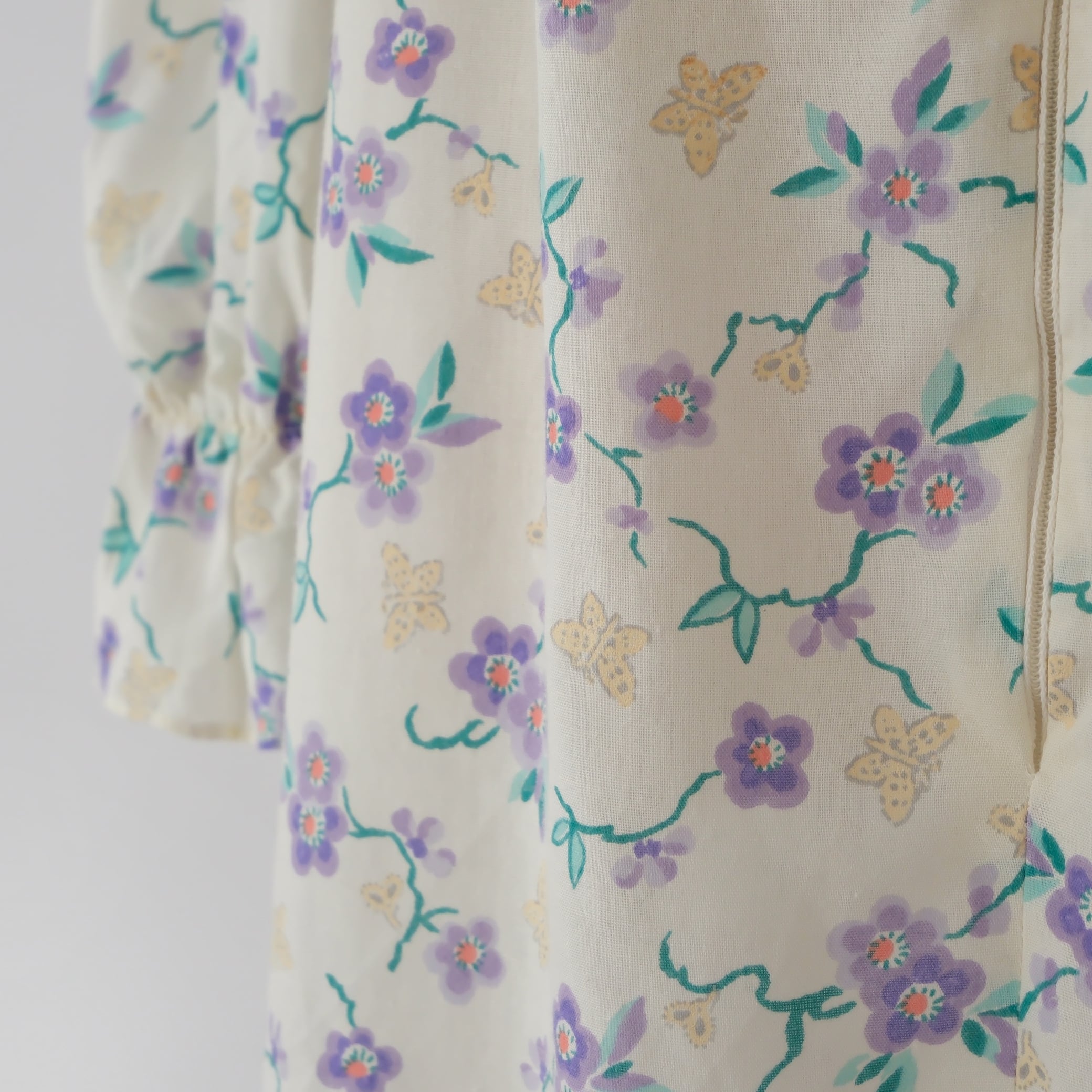 *パープルのお花とクリーム色の蝶々が素敵な一着です。両サイドには便利なポケット付。袖口に一部リペア跡が見られますが、目立つ汚れやダメージはなく、ヴィンテージとしてはコンディション良好な一点です。